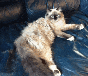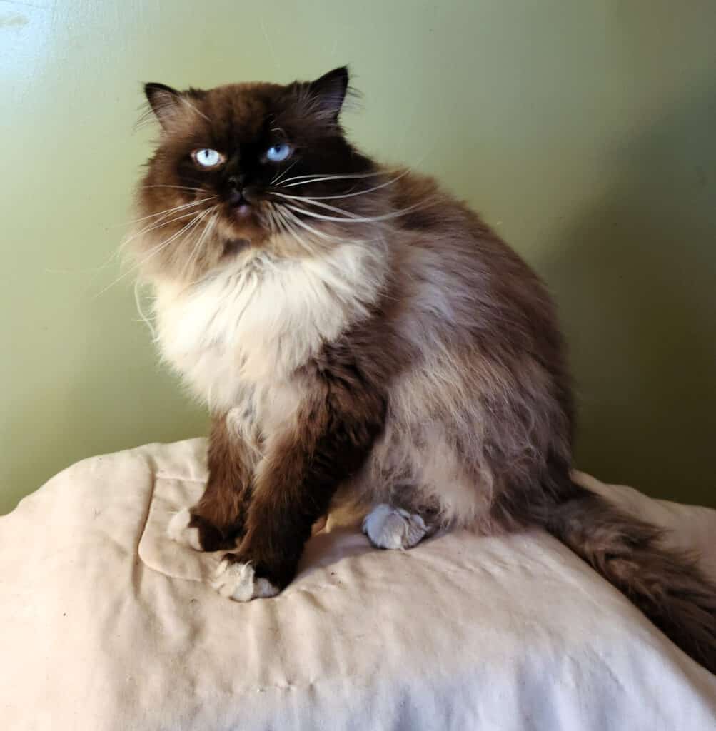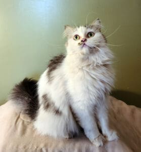 Cassidy is a hunk! He is a big cat with rabbit like coat and very blue, loving eyes. He is a “lover”, and … he is also a “talker”. Whenever we call his name he comes running, “meowing” to us to let us know he is on his way.